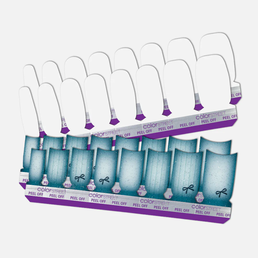 Turn up the Afternoon Charm with these powdery blue ombré dual-ended French glitter tips with vertical stripes and bow motifs. Dual-ended French tips are versatile and can be worn as either a traditional or French manicure.