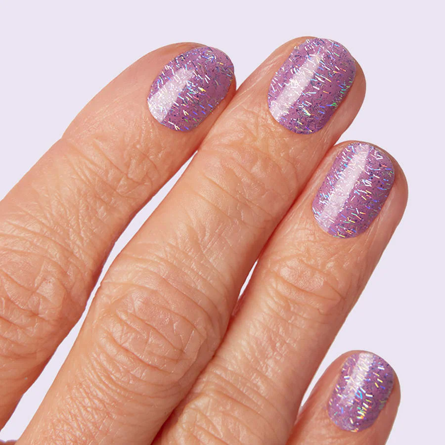 Blast through space with this lavender shade coated in brilliant galaxy glitter. Galaxy glitters feature a mixture of regular and holographic tinsel glitters creating an illusion of depth and dimension of colors that shift with movement.