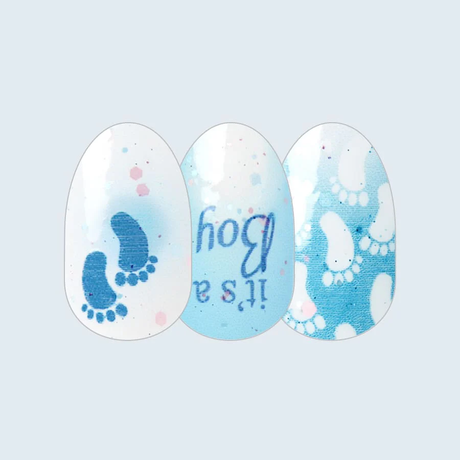 Jump for joy if It’s a Boy with this white and baby blue gradient glitter footprint design.